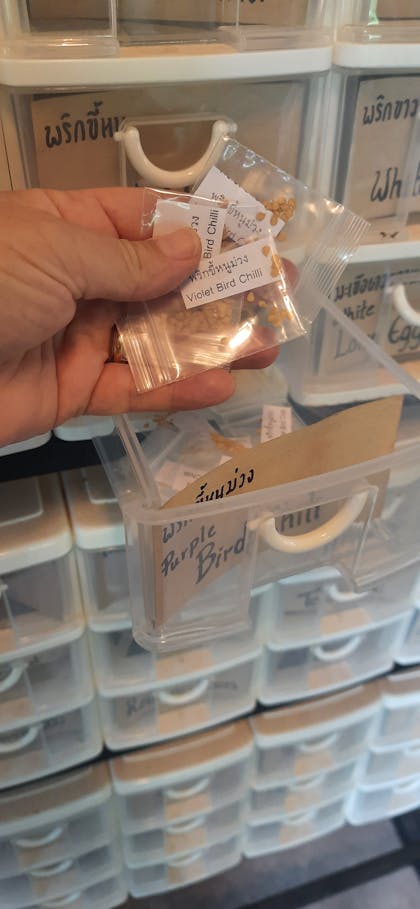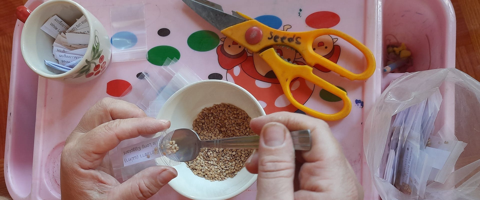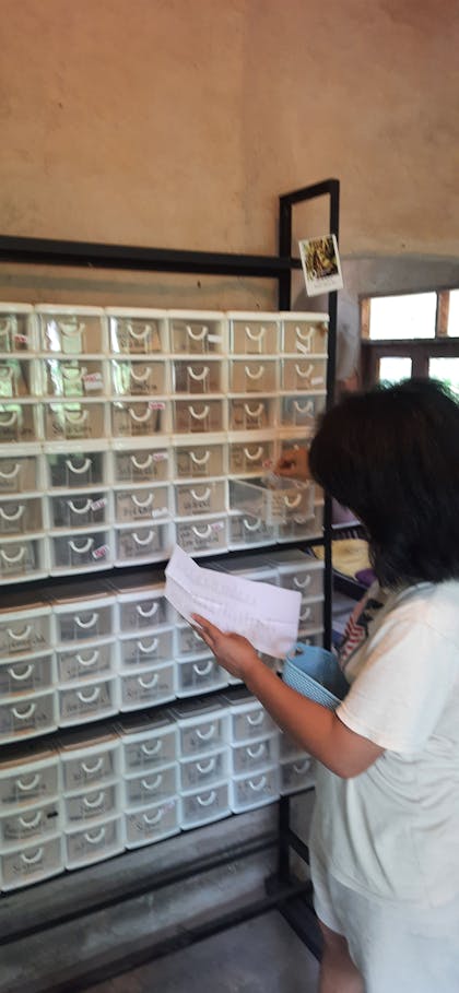Inside Pun Pun's Seed Center Room, housing a myriad of seeds, and hands at work with these seeds.