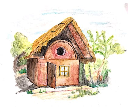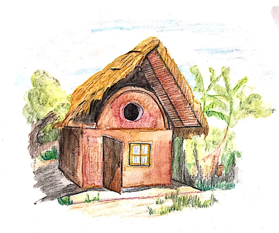 An illustration of a mud house in Pun Pun, based on a photograph on Pun Pun's website.
